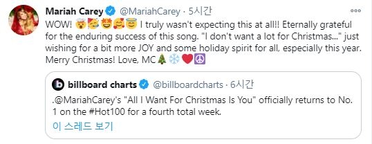 | ▲ 머라이어 캐리가 트위터로 자신의 곡이 빌보드 '핫 100' 1위에 오른 소식을 공유하며 감사를 표했다. [머라이어 캐리 트위터 갈무리] |