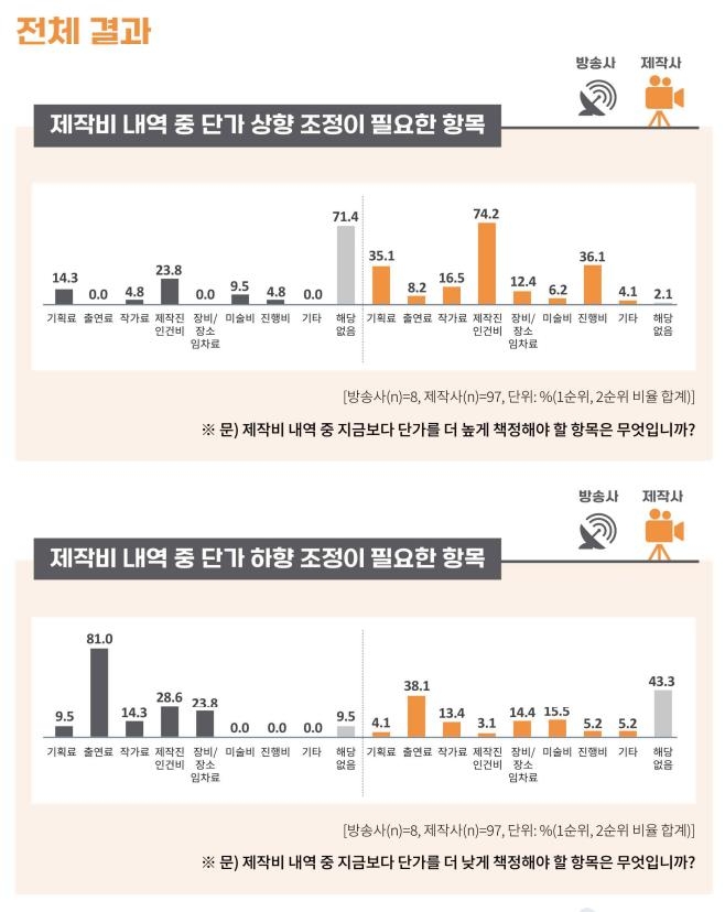 하향 조정이 필요한 항목에 대해 방송사들은 81%가 출연료를 꼽아 압도적으로 높은 비율이 나왔다. 제작진 인건비를 줄여야 한다는 의견도 28.6%가 나왔고, 장비·장소 임차료를 줄여야 한다는 의견도 23.8%에 달했다.