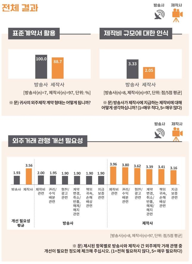 이에 따르면 지상파와 종편 방송사 총 8곳에 외주 제작사에 지급하는 제작비가 적정한지 인식을 조사한 결과 평균 3.33점으로 나타났다. 이번 조사는 매우 적다(1점)부터 매우 많다(5점) 사이 점수로 응답하게 해서 평균을 내는 방식으로 이뤄졌다.