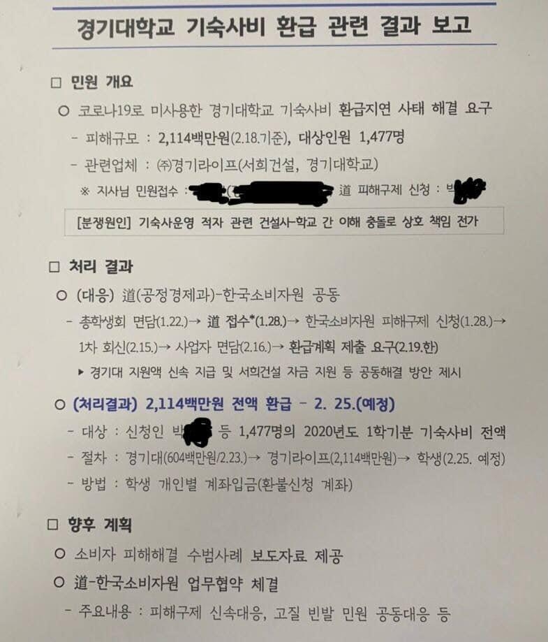 이후 도 공정국은 관련 자료를 수집해 한국소비자원에 신고하는 등 피해구제 조치에 나선 결과, 최근 경기대와 기숙사 운영업체로부터 '이달 25일까지 기숙사 미사용 기간의 기숙사비 전액을 환급하겠다'는 확약공문을 받았다고 설명했다.