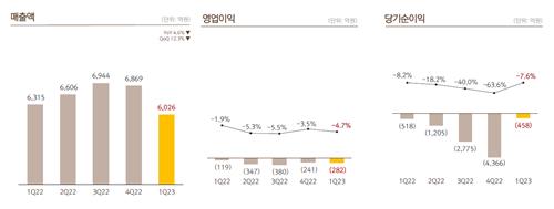 매출은 6천26억원으로 작년 동기 대비 4.6%, 직전 분기 대비 12.3% 감소했다. 순손실은 458억원으로 적자 폭이 축소됐다.