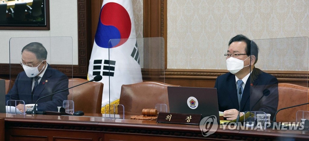| ▲ Prime Minister Kim Boo-kyum (R) speaks during an extraordinary Cabinet meeting at the government complex in Seoul on Jan. 21, 2022, to endorse a supplementary budget plan aimed at helping small businesses hit by the pandemic. Next to him is Finance Minister Hong Nam-ki. (Yonhap) |