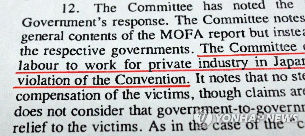 국제노동기구(ILO)가 1999년 3월 펴낸 전문가위원회 보고서는 일본이 2차 대전 중 한국과 중국의 노동자를 무더기 동원해 자국 산업시설에서 일을 시킨 것이 '협약 위반'(violation of the Convention)이라고 규정한 바 있다.