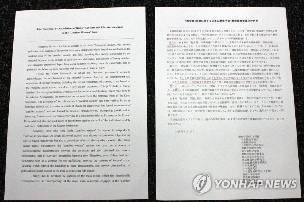 | ▲ 강제연행 실증됐다고 천명한 일본 역사단체 성명 (도쿄=연합뉴스) 이세원 특파원 = 역사학연구회 등 일본의 16개 역사 연구·교육 관련 단체가 2015년 5월 25일 영어와 일본어로 발표한 성명에 강제연행된 '위안부'의 존재는 많은 사료와 연구로 실증됐다는 설명이 실려 있다. |
