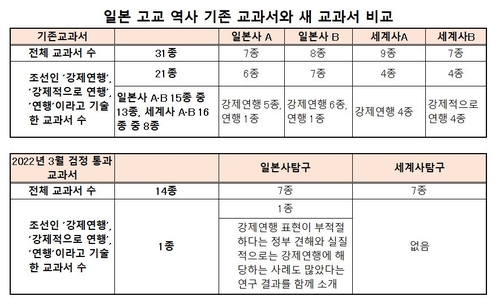 연합뉴스가 역사과목 기존 교과서 일본사A·B, 세계사A·B31종과 최근 검정을 통과한 일본사탐구·세계사탐구 14종을 분석한 결과 이같이 파악됐다.