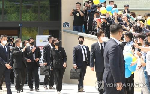 | ▲ 깨어있는 시민 문화 체험 전시관 둘러본 문 전 대통령 노무현 전 대통령 서거 13주기 추모제가 엄수된 지난 5월 23일 오전 문재인 전 대통령이 경남 김해시 진영읍 봉하마을 '깨어있는 시민 문화 체험 전시관'을 방문 후 이동하고 있다. 2022.5.23 |