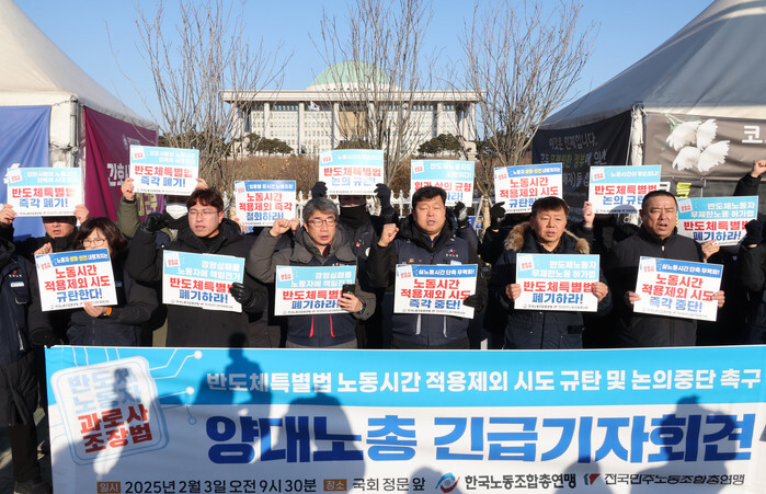 Members of the two biggest umbrella labor unions -- the Federation of Korean Trade Unions and the Korean Confederation of Trade Unions -- shout slogans during a rally in front of the National Assembly in Seoul on Feb. 3, 2025, to demand that parliament not approve a bill that includes an exception to the 52-hour workweek rule for the semiconductor industry. (Yonhap)