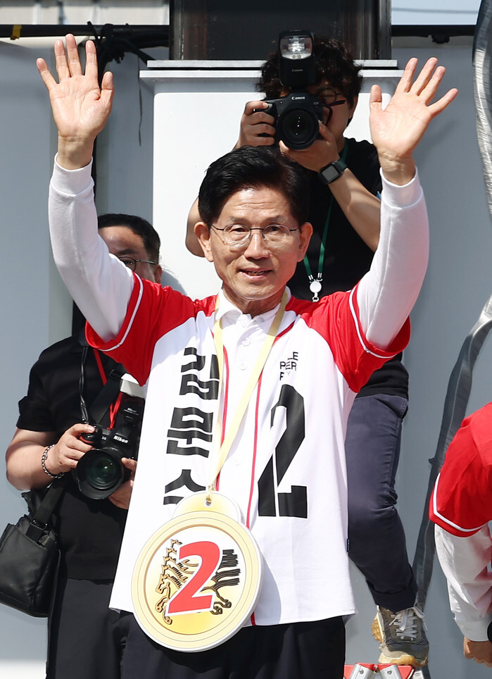 Kim Moon-soo, the presidential candidate of the conservative People Power Party, waves to voters as he gives a stump speech in Jinju, South Gyeongsang Province, southeastern South Korea, on May 14, 2025, ahead of the June 3 presidential election. (Pool photo) (Yonhap)