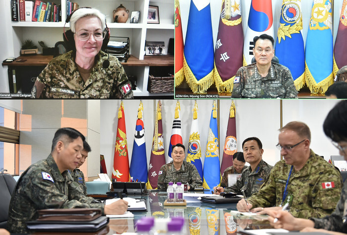 South Korean Joint Chiefs of Staff Chairman Adm. Kim Myung-soo (R, top) and his Canadian counterpart, Gen. Jennie Carignan (L, top), hold video talks on Jan. 8, 2024, in this combined photo provided by Kim's office. (PHOTO NOT FOR SALE) (Yonhap)