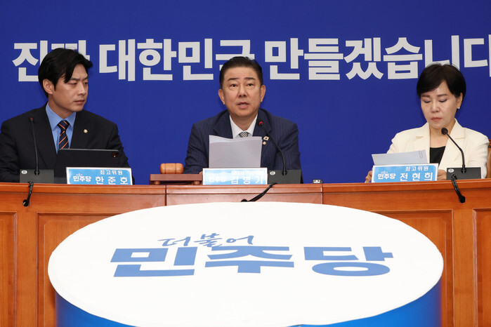 Kim Byung-kee (C), acting leader and floor leader of the ruling Democratic Party, speaks during a meeting of the party's Supreme Council at the National Assembly in Seoul on July 2, 2025. (Yonhap)