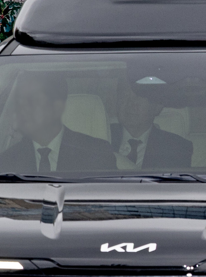A minivan carrying ousted President Yoon Suk Yeol (rear) enters the Seoul Central District Court's compound in the capital on April 14, 2025, before Yoon attends the first hearing of a trial over insurrection charges in connection with his declaration of martial law. (Yonhap)