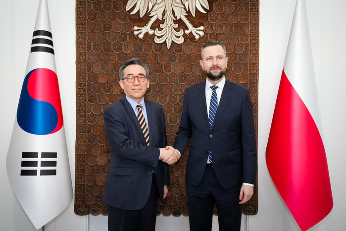 South Korean Foreign Minister Cho Tae-yul (L) poses for a photo with Polish Deputy Prime Minister and Defense Minister Wladyslaw Kosiniak-Kamysz in Warsaw on March 6, 2025, in this photo provided by the foreign ministry. (PHOTO NOT FOR SALE) (Yonhap)