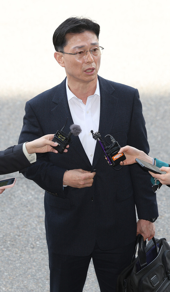 Lim Seong-geun, former commander of the 1st Division of the Marine Corps, speaks to reporters as he appears at the office of the Corruption Investigation Office for High-ranking Officials in the government complex in Gwacheon, south of Seoul, on April 23, 2025, as the state anti-corruption investigation office resumes its investigation over allegations of external pressure placed on the military probe into the death of one of his subordinate soldiers during a rescue operation for victims of heavy downpours in July 2023. (Yonhap)