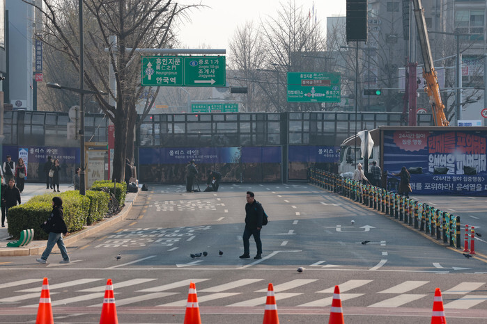 A road leading to the Constitutional Court in Seoul is temporarily cordoned off with a provisional wall set up by police on April 3, 2025, one day before the court hands down a decision on whether to remove impeached President Yoon Suk Yeol from office or reinstate him over his brief imposition of martial law in early December. (Yonhap)