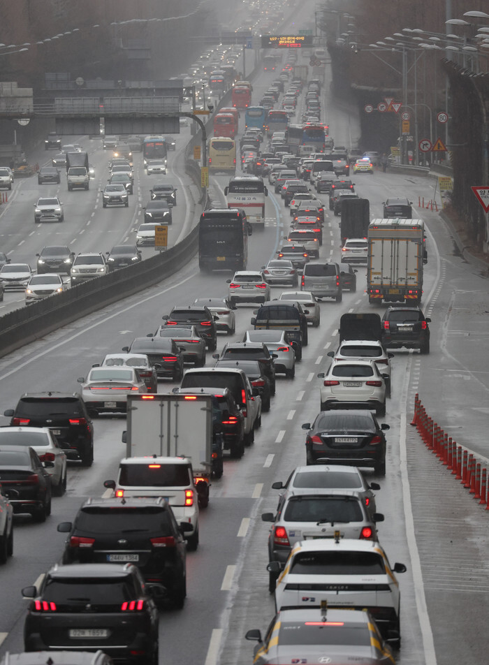 Heavy traffic clogs one side of a highway linking Seoul to the southeastern port city of Busan in Seoul's Seocho Ward on Jan. 27, 2025, the third day of a six-day break for Seol, or Lunar New Year, which falls on Jan. 29. (Yonhap)