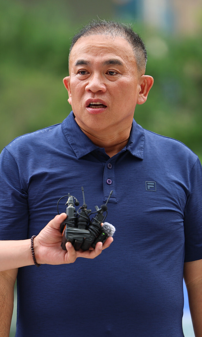 Self-proclaimed power broker Myung Tae-kyun speaks to reporters upon arrival at the office of a special counsel team in Seoul on July 31, 2025, to be questioned by the team as part of an investigation into an election meddling scandal surrounding Kim Keon Hee, wife of former President Yoon Suk Yeol. (Yonhap)