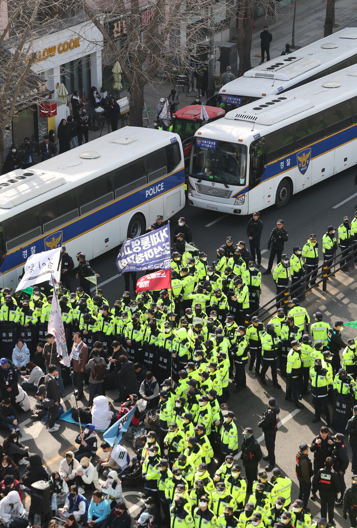 A standoff between police officers and members of the Korea Peasants League, or Jeonnong, clogs a road in Seoul on March 26, 2025, as the farmers' group stages a sit-in to call for the ouster of impeached President Yoon Suk Yeol in connection with his short-lived imposition of martial law in December. (Yonhap)