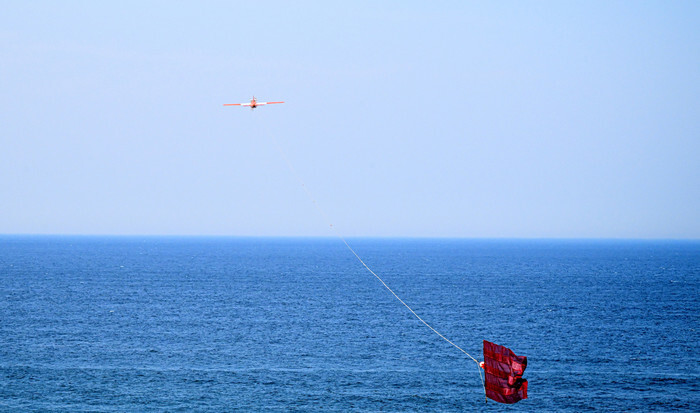 An aerial target flies over the sea off a beach in Goseong, Gangwon Province, northeastern South Korea, as the Army conducts an anti-aircraft live-fire drill, in this undated photo released by the Army on May 2, 2025. The three-day drill began April 30. (PHOTO NOT FOR SALE) (Yonhap)
