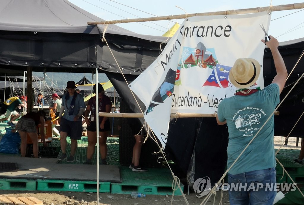 | ▲ 철거하는 독일 부스 (부안=연합뉴스) 나보배 기자 = 세계스카우트연맹 잼버리 대회가 열리는 부안군에서 조기 철수를 결정한 7일, 독일 대원들이 부스를 철거하고 있다. 2023.8.7 warm@yna.co.kr |