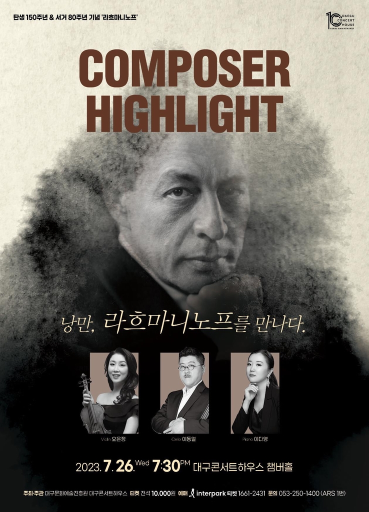 ▲ 대구콘서트하우스는 오는 26일 오후 7시 30분 챔버홀에서 러시아의 대표적인 피아니스트이자 작곡가인 라흐마니노프(1873∼1943)의 작품 세계를 소개하는 공연을 개최한다고 12일 밝혔다. 이번 공연은 바이올리니스트 오은정, 첼리스트 이동열, 피아니스트 이다영이 함께 한다. (대구=연합뉴스)