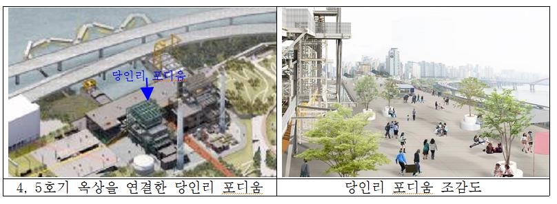 이중 외부 18m(5층) 높이 4·5호기의 옥상은 하나로 연결해 한강이 내려다보이는 옥상광장('당인리 포디움')으로 만들어 마로니에공원 같은 열린 공간으로 설계된다. 이곳은 이동식 화단을 활용한 친환경적인 도시농업, 버스킹 공연, 야외패션쇼 등이 이뤄지고 청년 푸드트럭 등 소상공인 중심 시설이 자리 잡는 공간이 될 전망이다.