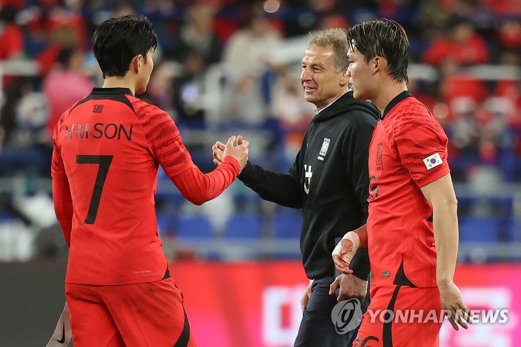 | ▲ 손흥민과 인사하는 클린스만 감독 (울산=연합뉴스) 신현우 기자 = 24일 오후 울산 문수축구경기장에서 열린 대한민국 대 콜롬비아 축구 대표팀의 평가전이 2-2 무승부로 끝난 뒤 위르겐 클린스만 감독이 2골을 기록한 손흥민과 인사하고 있다. 2023.3.24 nowwego@yna.co.kr |