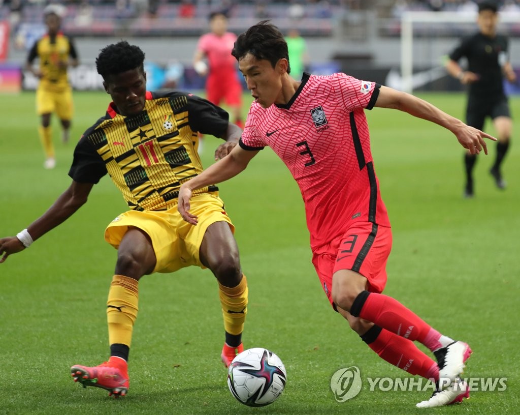 | ▲ In this file photo from June 12, 2021, Kim Jin-ya (R) of the South Korean men's Olympic football team tries to dribble past Samuel Abbey-Ashie Quaye of Ghana for the ball during their teams' friendly match at Jeju World Cup Stadium in Seogwipo, Jeju Island. (Yonhap) |