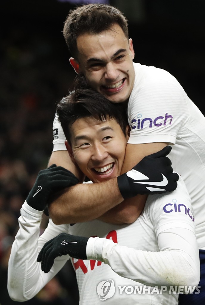 | ▲ In this Action Images photo via Reuters, Son Heung-min of Tottenham Hotspur (L) is congratulated by teammate Sergio Reguilon after scoring a goal against Brentford during the clubs' Premier League match at Tottenham Hotspur Stadium in London on Dec. 2, 2021. (Yonhap) |