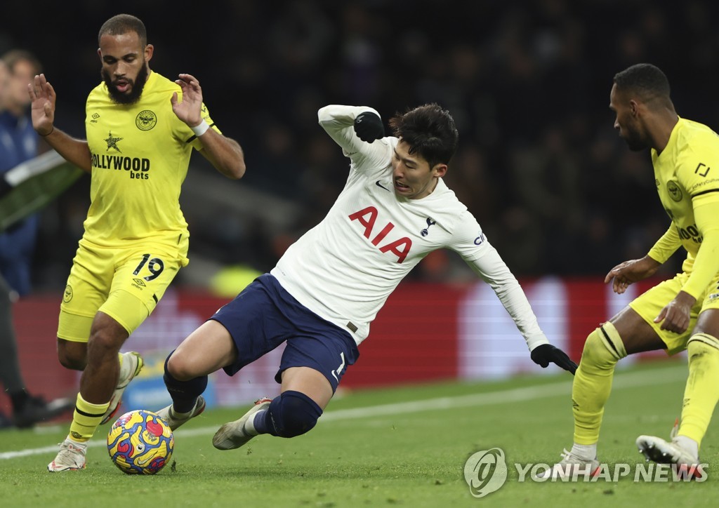 | ▲ In this Associated Press photo, Son Heung-min of Tottenham Hotspur (C) challenges Bryan Mbeumo of Brentford (L) for the ball during the clubs' Premier League match at Tottenham Hotspur Stadium in London on Dec. 2, 2021. (Yonhap) |
