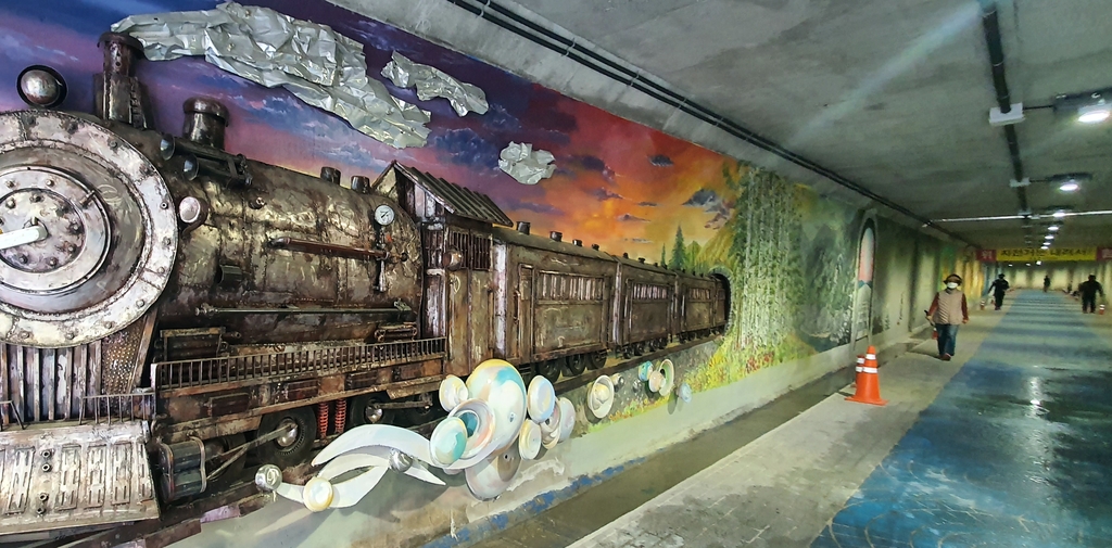 (춘천=연합뉴스) 이상학 기자 = 강원 춘천시가 도심인 퇴계동 산책로 터널에 공공미술 프로젝트 일환으로 조성한 '춘천가는 예술기차' 벽화가 오픈을 앞두고 관심이 높다.