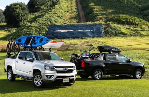 | ▲ This photo provided by GM Korea on Aug. 26, 2019, shows Colorado pickup trucks, carrying a bicycle, a motorcycle and kayaks, at Welli Hilli Park in Hoengseong, 140 kilometers east of Seoul. (PHOTO NOT FOR SALE) (Yonhap) |
