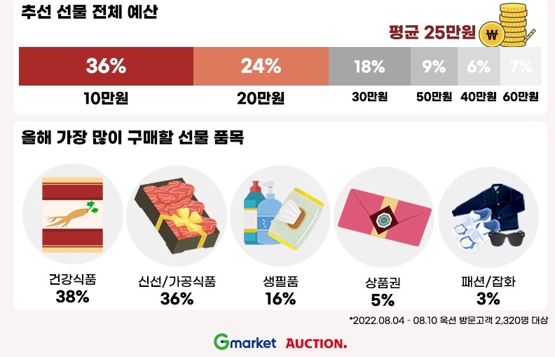 추석 선물 총예산은 평균 25만원으로 조사됐고, 인기 품목은 건강식품(38%)과 신선·가공식품(36%), 생필품(16%) 등이었다.