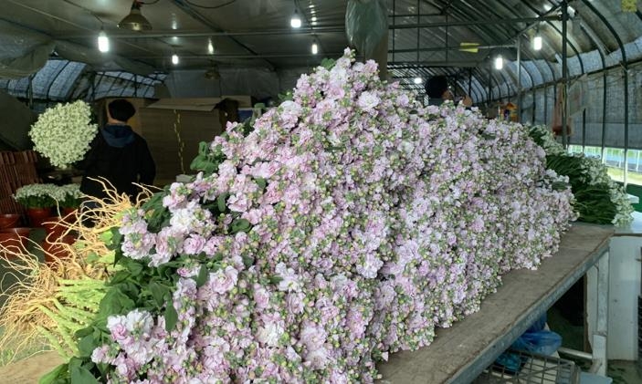 저온성 화훼 품종인 스토크는 10월 중순부터 출하를 시작해 1단(6개 묶음)에 상품기준 1만원에 판매되고 있다.