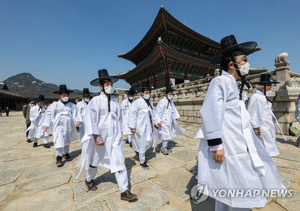 | ▲ 퇴계 선생의 귀향길 따라 도산서원으로 향합니다 (서울=연합뉴스) 황광모 기자 = 4일 오후 서울 경복궁 사정전(思政殿) 내 만춘전(萬春殿) 앞에서 열린 제3회 퇴계 선생 귀향길 걷기 '퇴계의 길에서 길을 묻다' 개막식을 마친 참가자들이 도포와 갓을 차려입고 출발해 근정전 앞을 지나고 있다. 도산서원과 도산서원 선비문화수련원이 주최하는 이 행사는 서울 경복궁을 출발해 오는 17일까지 2주간 진행된다. 참가자들은 서울 경복궁에서 경북 안동 도산서원까지 선조 임금의 만류에도 공직에서 물러난 퇴계 선생의 발자취를 따라 700리(276Km)를 걷고, 때로는 뱃길을 이용할 계획이다. 2022.4.4 hkmpooh@yna.co.kr |