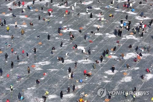 | ▲ Visitors enjoy fishing on a frozen river at the 2020 Hwacheon Sancheoneo Ice Festival in the Gangwon Province county of Hwacheon, 88 kilometers northeast of Seoul, on Jan. 27, 2020. (Yonhap) |