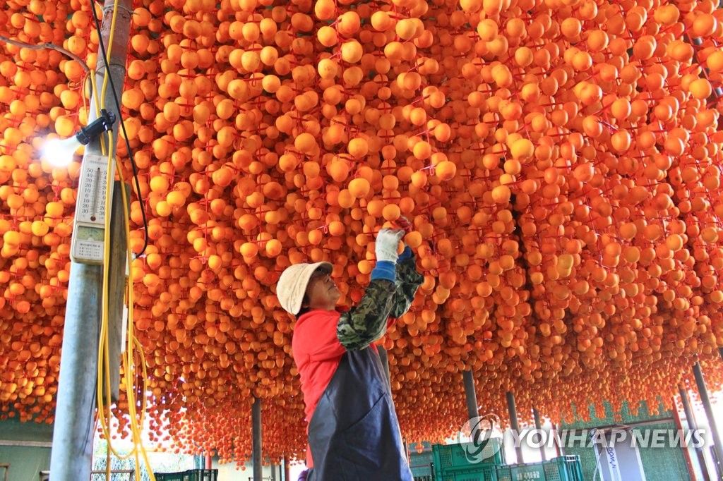 | ▲ A farmer binds peeled persimmons together to dry them in Yeongdong, a town in North Chungcheong Province, on Oct. 25, 2022. Dried persimmons, called "gotgam" in Korean, are a favorite Korean delicacy. (Yonhap) |