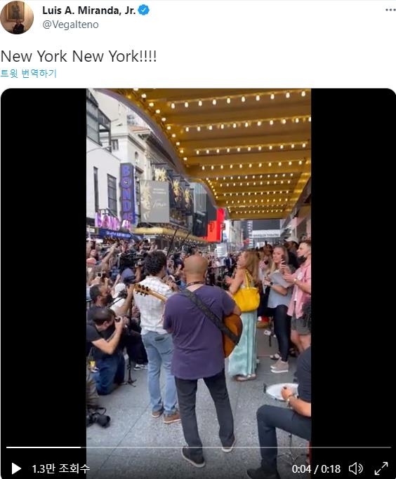 ▲ '해밀턴' 공연 재개 앞두고 극장 앞에서 '뉴욕, 뉴욕' 부르는 출연진 [트위터 캡처]