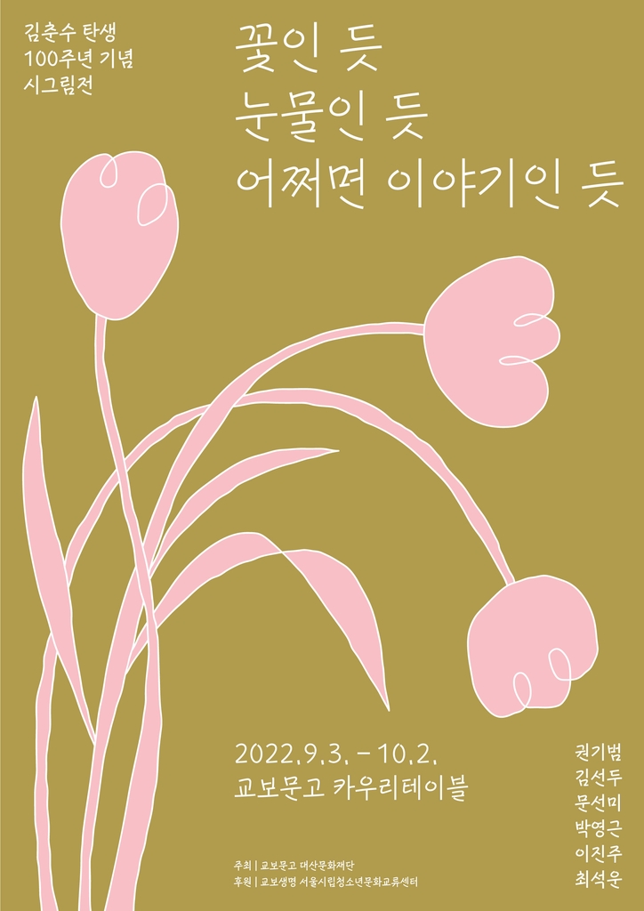 (서울=연합뉴스) 성도현 기자 = 교보문고와 대산문화재단은 김춘수(1922∼2004) 시인 탄생 100주년을 맞아 시그림전 '꽃인 듯 눈물인 듯 어쩌면 이야기인 듯'을 개최한다고 5일 밝혔다.