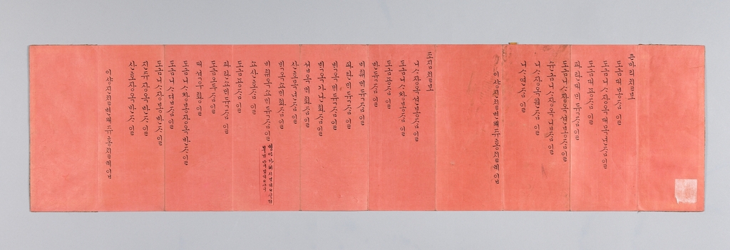 한글로 작성된 이 기록물은 두툼한 붉은색 종이를 아코디언 식으로 접어 만들었다.