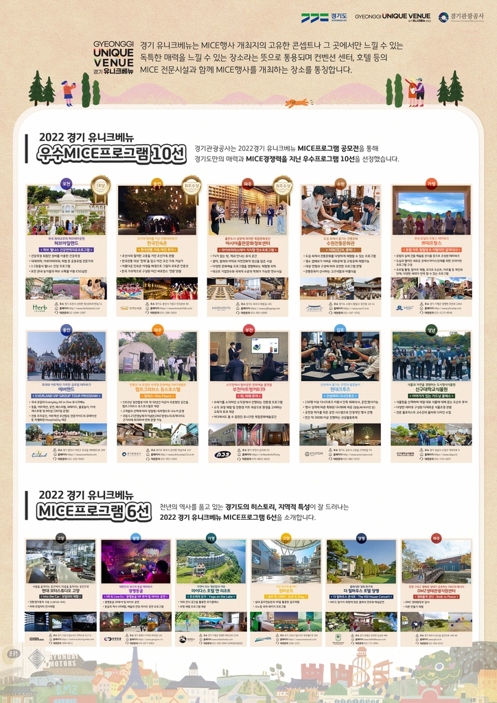(수원=연합뉴스) 경기도와 경기관광공사는 '경기 유니크 베뉴'(지역이색 회의명소) 마이스(MICE) 체험 프로그램 개발 공모전을 통해 16개 우수 프로그램을 선정했다고 24일 밝혔다.