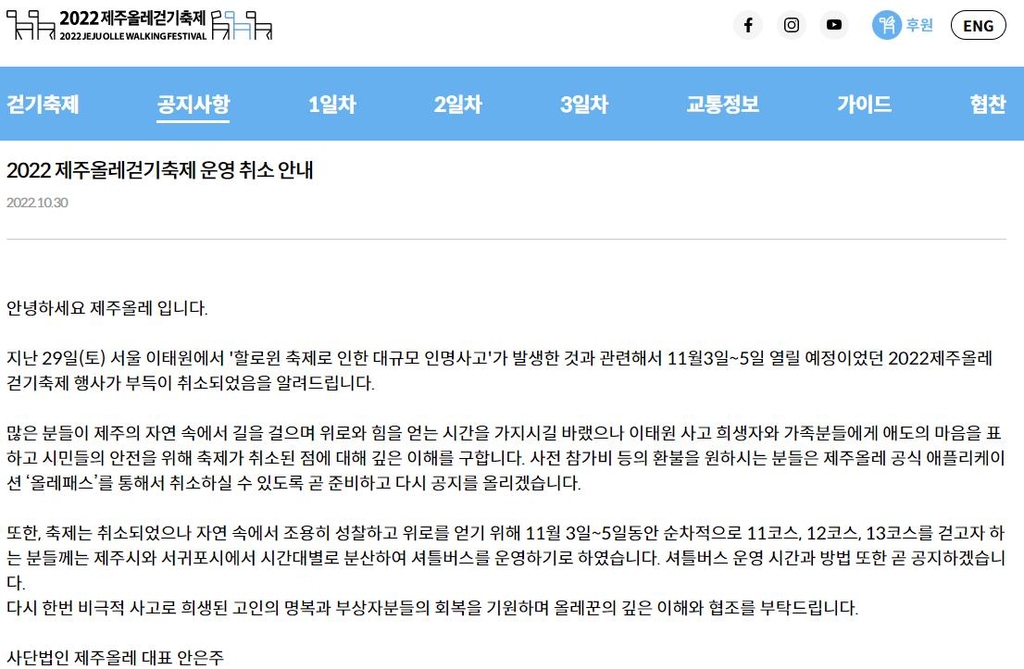 제주올레는 홈페이지와 사회관계망서비스(SNS)를 통해 "많은 분이 제주의 자연 속에서 길을 걸으며 위로와 힘을 얻는 시간을 갖길 바랐으나 이태원 사고 희생자와 가족에 애도의 마음을 표하고 시민 안전을 위해 축제를 취소하게 됐다"며 이해를 구했다.