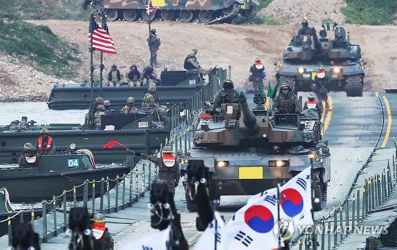 | ▲ South Korean and U.S. troops conduct combined river-crossing drills in Yeoju, Gyeonggi Province, in this Nov. 20, 2025, file photo. (Yonhap) |