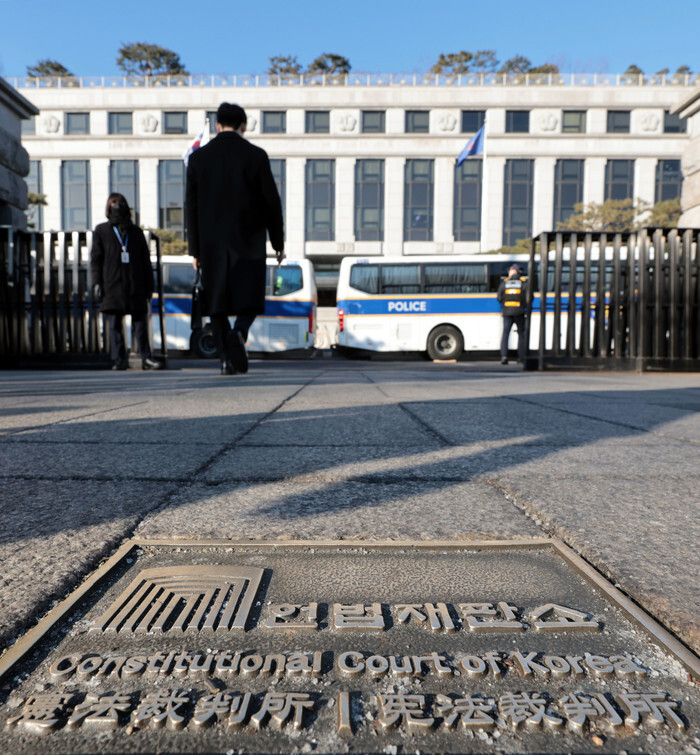 Police officers stand guard in front of the Constitutional Court in Seoul on Feb. 24, 2025, one day before the court holds the final hearing of arrested President Yoon Suk Yeol's impeachment trial in connection with his short-lived imposition of martial law in December. (Yonhap)