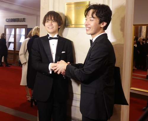 | ▲ 프랑스 롱티보 콩쿠르 공동 1위 한·일 피아니스트들 (파리=연합뉴스) 현혜란 특파원 = 프랑스 파리 샤틀레 극장에서 13일(현지시간) 오후 열린 롱티보 국제 콩쿠르 피아노 부문 시상식 겸 갈라 무대가 끝나고 난 뒤 공동 1위를 차지한 이혁(22·한국·오른쪽)과 마사야 카메이(20·일본)가 악수를 하고 있다. 2022.11.13 runran@yna.co.kr |