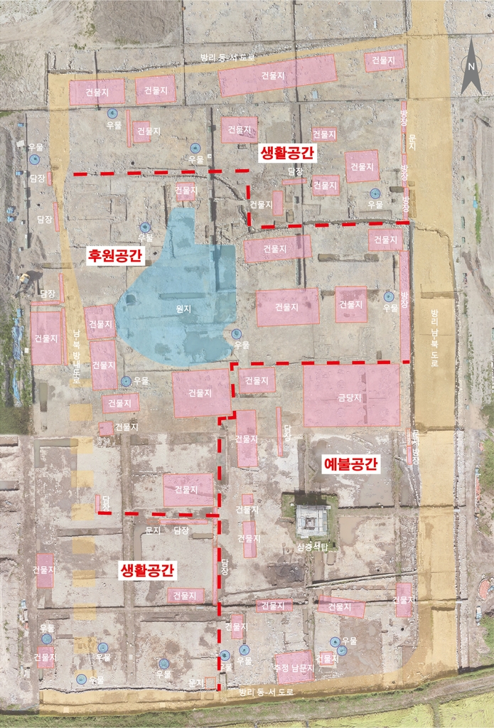 사찰은 삼층석탑과 금당으로 구성된 예불 공간, 승려들이 거주하는 승방과 부속 건물 등으로 이뤄진 생활 공간, 정원 안에 있는 연못(園池·원지) 일원의 후원 등으로 나뉘었던 것으로 확인됐다.