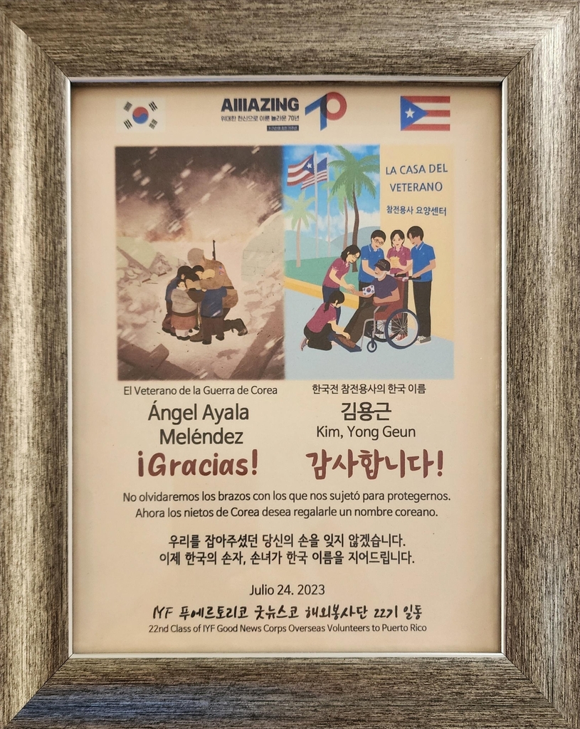 | ▲ 앙헬 아냘라 참전용사는 '김용근'(용기의 뿌리)이라는 이름을 지어줬다 [최은성 IYF 푸에르토리코 지부장 제공] |