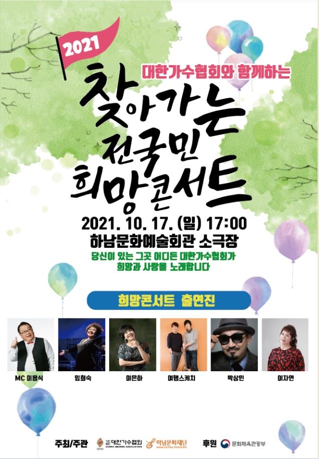 (서울=연합뉴스) 이태수 기자 = 대한가수협회는 17일 오후 5시 경기도 하남문화예술회관 소극장에서 백신접종 완료자를 대상으로 하는 무료 공연 '찾아가는 전국민 희망콘서트'를 연다고 13일 밝혔다.