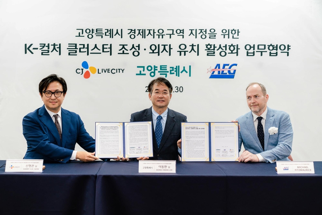 1일 시에 따르면 이동환 시장과 신형관 CJ 라이브시티 대표, 마이클 피츠모리스 AEG 아시아 담당 부사장이 전날 일본 오사카에서 K-컬처 클러스터 조성 및 외자 유치 활성화 업무협약(MOU)에 서명했다.