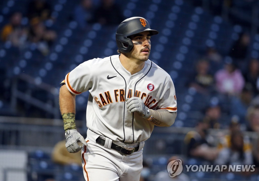 | ▲  In this Getty Images file photo from May 15, 2021, Mike Tauchman of the San Francisco Giants watches his two-run home run against the Pittsburgh Pirates in the top of the sixth inning of a Major League Baseball regular season game at PNC Park in Pittsburgh. (Yonhap) |