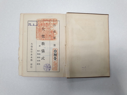 마지막으로 대각교의식(大覺敎儀式)은 민족대표 33인 중 한 사람인 백용성(1864∼1940)이 불교 대중화를 위해 '대각교'를 창립하고 저술한 책으로, 불교계의 각종 의식을 간소화한 내용과 찬불가 7편을 수록하고 있다.